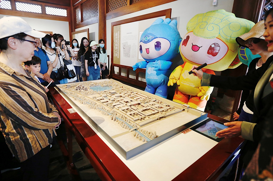 本次活动的第一站,是南宋德寿宫遗址博物馆。讲解老师将德寿宫内主要建筑的来源、殿内布置等娓娓道来,还详细介绍了修复后的德寿宫全址沙盘。“智能亚运城市体验团”的成员们各个都聚精会神仔细聆听。