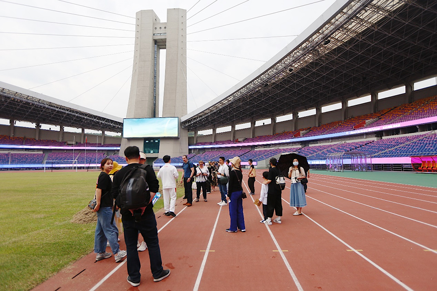 杭州亚运会期间,黄龙体育中心体育场、体育馆及游泳跳水馆将分别举办足球决赛、体操(竞技体操、艺术体操、蹦床)以及水球赛事,亚残运会期间,黄龙体育场则是田径比赛场地。听着工作人员的介绍,大家对场馆所体现出的绿色、智能、节俭、文明等理念,也有了一定的了解。