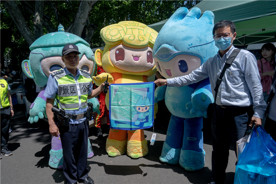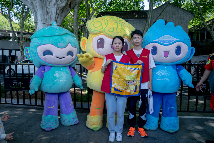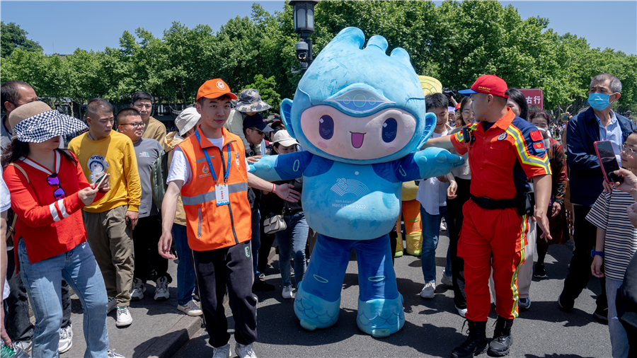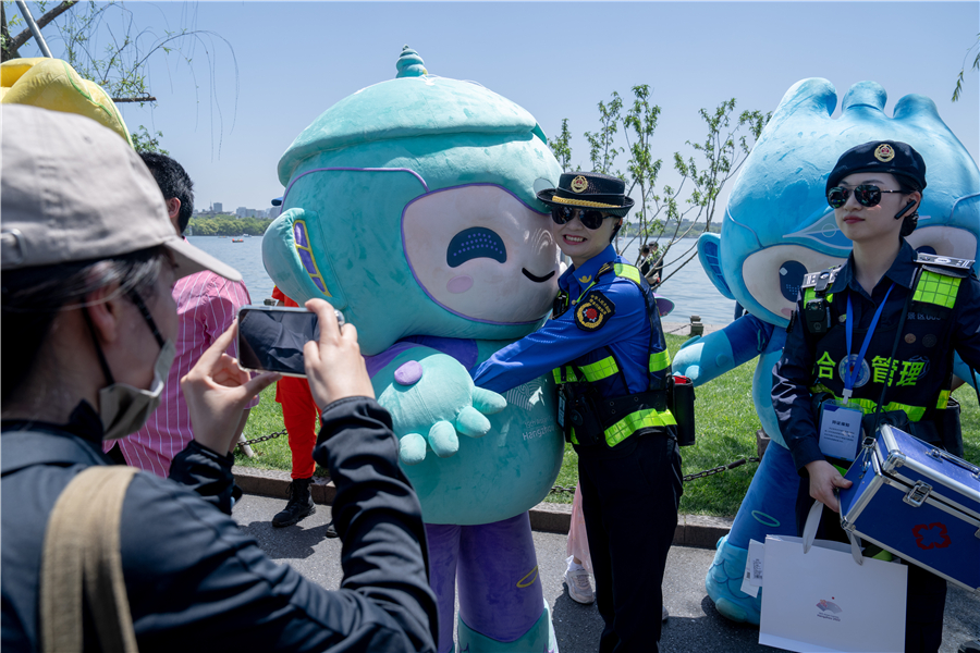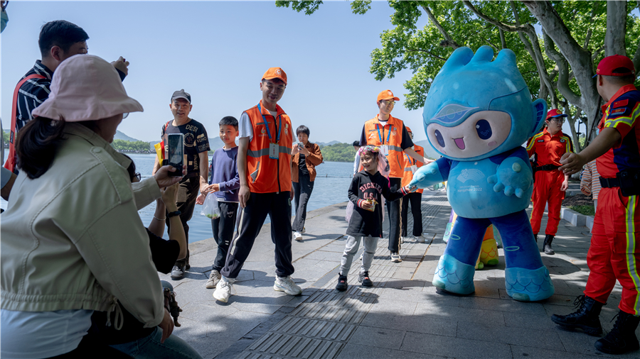 历时两个多小时,“三小只”还给环卫工、消防员们送上了亚运礼物,最后他们的西湖之旅在孤山收尾。