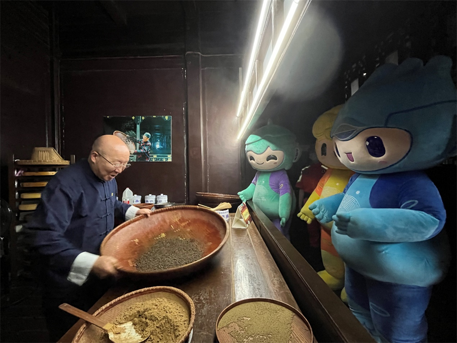 6月6日,由杭州亚组委宣传部亚运吉祥物办公室与上城区非遗保护中心共同举办的“吉祥物体验非遗传承”活动进入到了第三站——胡庆余堂中药文化非遗课堂,亚运“三小只”来到胡庆余堂中药博物馆拜师学艺,在走进中医药瑰丽宝库的同时,体验中华博大精深的医药文化。