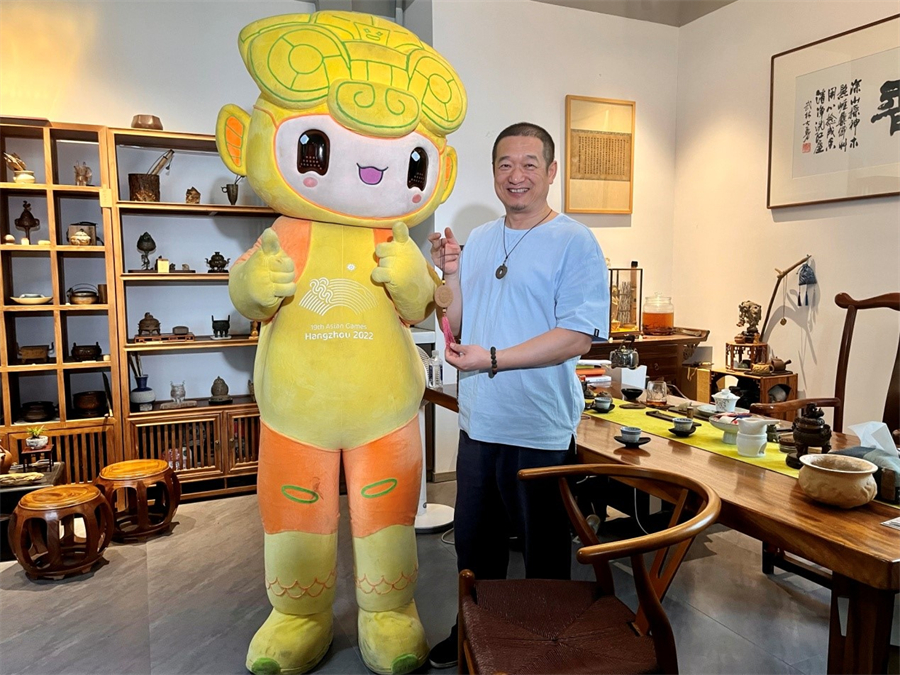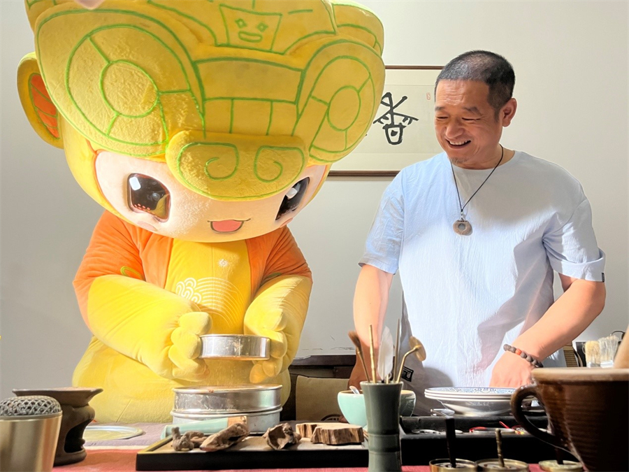 现场,杭州亚运吉祥物“琮琮”仔细聆听蒋锐老师讲解和指导,从研磨香料到赋形脱模每个步骤动手体验,“琮琮”一丝不苟完成。本次制作的香牌主香料选用杭州市花——桂花,辅以沉香、檀香和薄荷等天然香料。模具则由蒋锐设计,灵感来源于亚运主场馆“莲花碗”,寓意莲花盛开,“吉香如意”,中间是“杭州亚运”的字样。经过一阵忙活,“琮琮”制作出属于自己的一款“亚运+宋韵”主题香牌。蒋锐直夸琮琮领悟能力高,动手能力强,非常可爱。继而“琮琮”向蒋锐敬茶拜师,致敬传统香道。