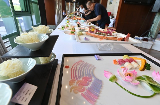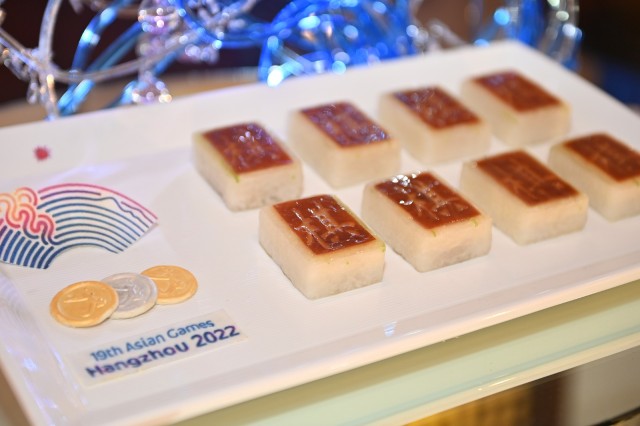 杭州知味观味庄团队做的一桌菜写满了“亚运祝福”。总厨严小华说,这桌菜以“亚运定胜”为主题,每道菜都是厨师们希望杭州亚运会能圆满举行的“心意写照”。“例如,主盘菜名叫《风荷》,荷花与鲤鱼的造型寓意和谐美满;一颗颗绿苹果是点心,寓意平平安安;定胜糕就不用说了,那是杭州传承千百年的老底子祝福……”
