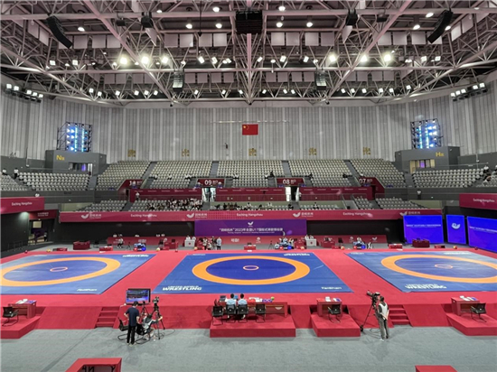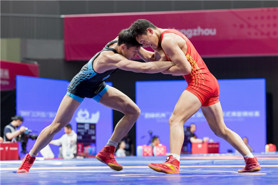 抱腿、勾脚、过肩摔……在摔跤竞赛场上,红蓝两方选手闪、躲、腾、挪不断变化的动作,观众欢呼喝彩声、掌声不断。