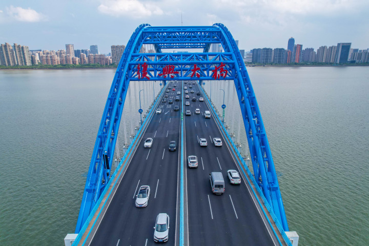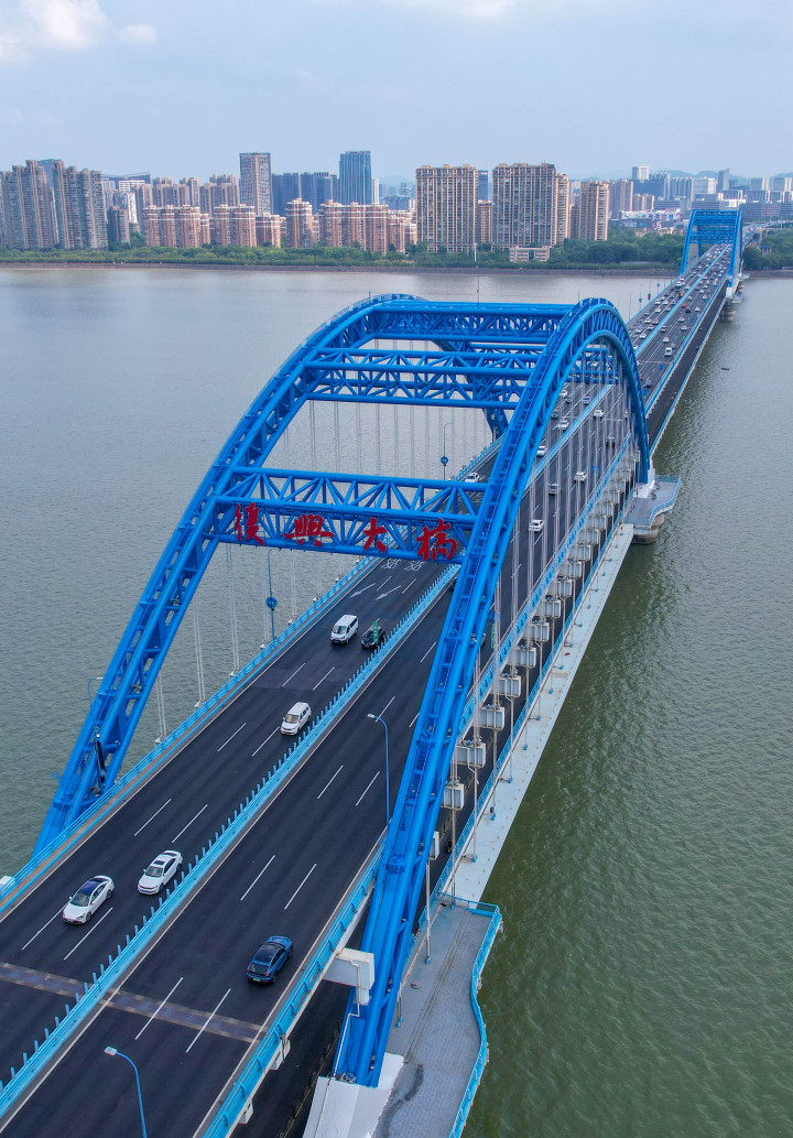 8月21日,蓝天白云映衬下的杭州复兴大桥,显得格外清新亮丽。复兴大桥横跨钱塘江二十载,是杭州市第一座跨钱塘江的双层桥面钢管拱景观桥梁,也是重要的亚运通勤通道。日前,杭州市政部门利用夜间全封闭时间以及错高峰时段,分别对复兴大桥的2个190米跨大拱和9个85米跨小拱开展环保涂装翻新。为了确保大桥整体景观效果与钱塘江的自然风光和谐统一,大桥依然主打专属的蓝色“彩妆”。