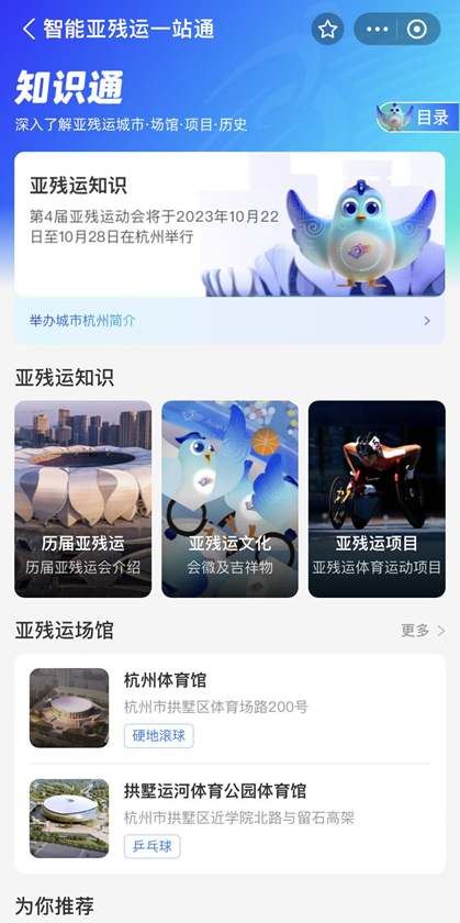 如果还想更多了解亚残运会相关信息的也可通过“知识通”了解。“知识通”将历届亚残运会介绍、亚残运会文化、亚残运会项目等亚残运会相关的信息进行多维度的呈现,让更多人通过智能亚残运一站通了解亚残运会,让残疾人体育运动被更多人看到。