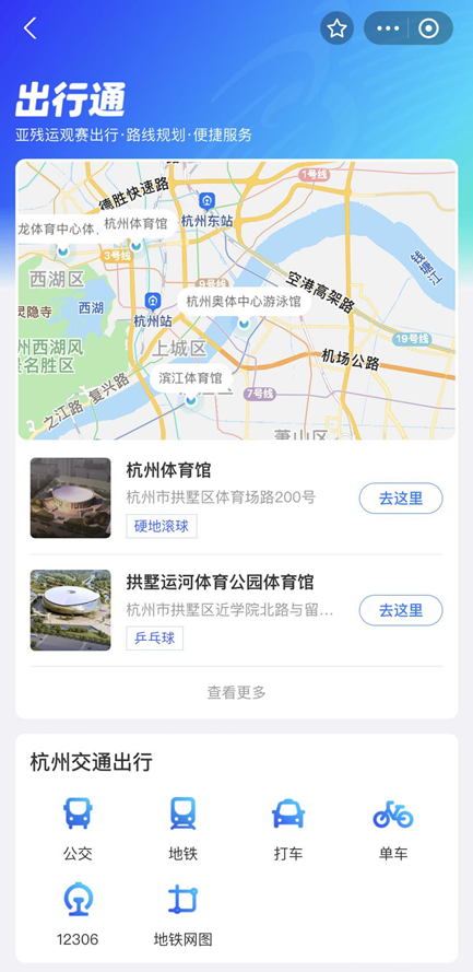 如何保障残障人士便捷出行、顺利到达目的地?通过“出行通”可以实现亚残运场馆为目的地的行程规划,囊括公交、地铁、单车各种出行形式,让你用最高效的方式到达想去的观赛场馆。此外,智能亚残运一站通贴心地附上了杭州市地铁网图,方便用户在亚残运会期间便捷出行。