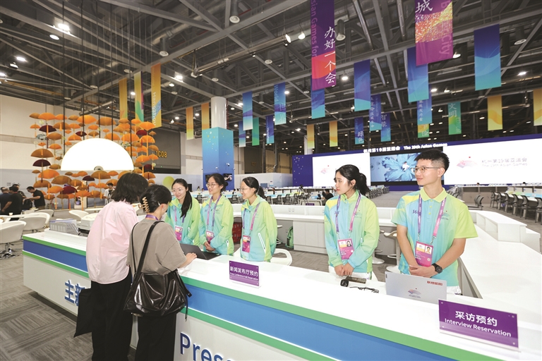 日前,位于杭州国际博览中心的杭州亚运会主媒体中心启动试运行,开门迎接来自世界各地的媒体记者。图为主新闻中心。