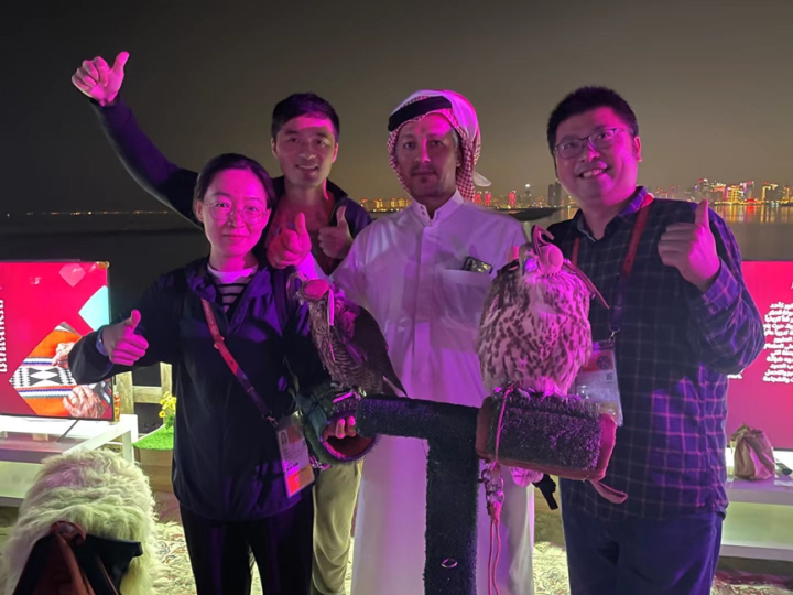 潮新闻记者王佳骏(左2)和解放日报陈华(右1)在卡塔尔世界杯中相识。