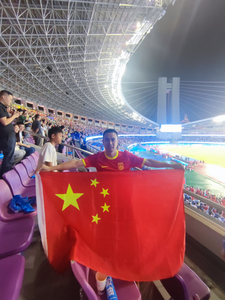 十几年后的今天,还是一样的红色球服。只不过,他在脸颊上又多贴了两枚爱心型的五星红旗,人群中的他,格外显眼。看台上一位小球迷指着他对身旁的朋友说,“你看,那边有个爷爷好可爱。”